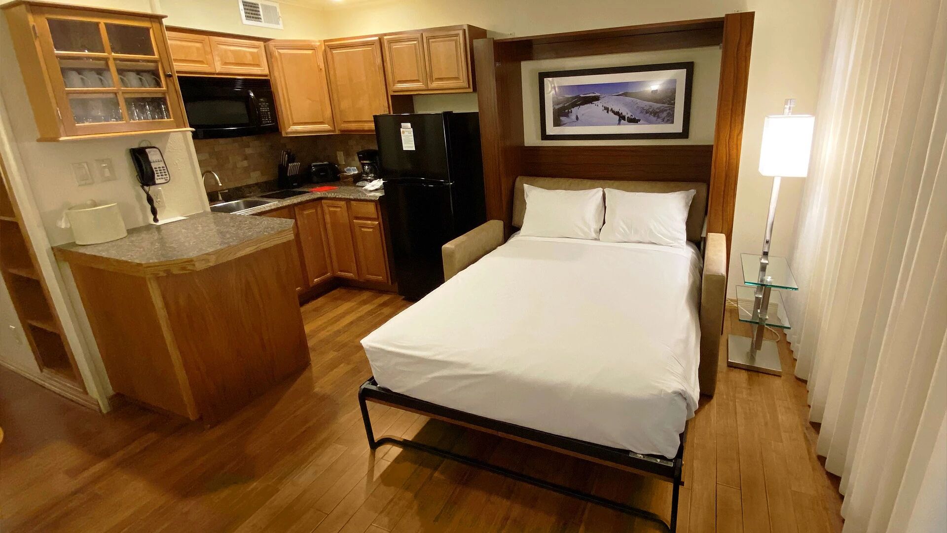 At The Christie Lodge, you'll enjoy coming back to your one or three-bedroom villa at the end of the day. Each suite features a kitchenette, dining table, fireplace, queen-sized bed, queen-sized sleeper sofa, child size daybed, television, telephone, balcony or patio and complimentary Wi-Fi access. One-bedrooms are well-suited for four guests, while three-bedrooms can accommodate up to eight.