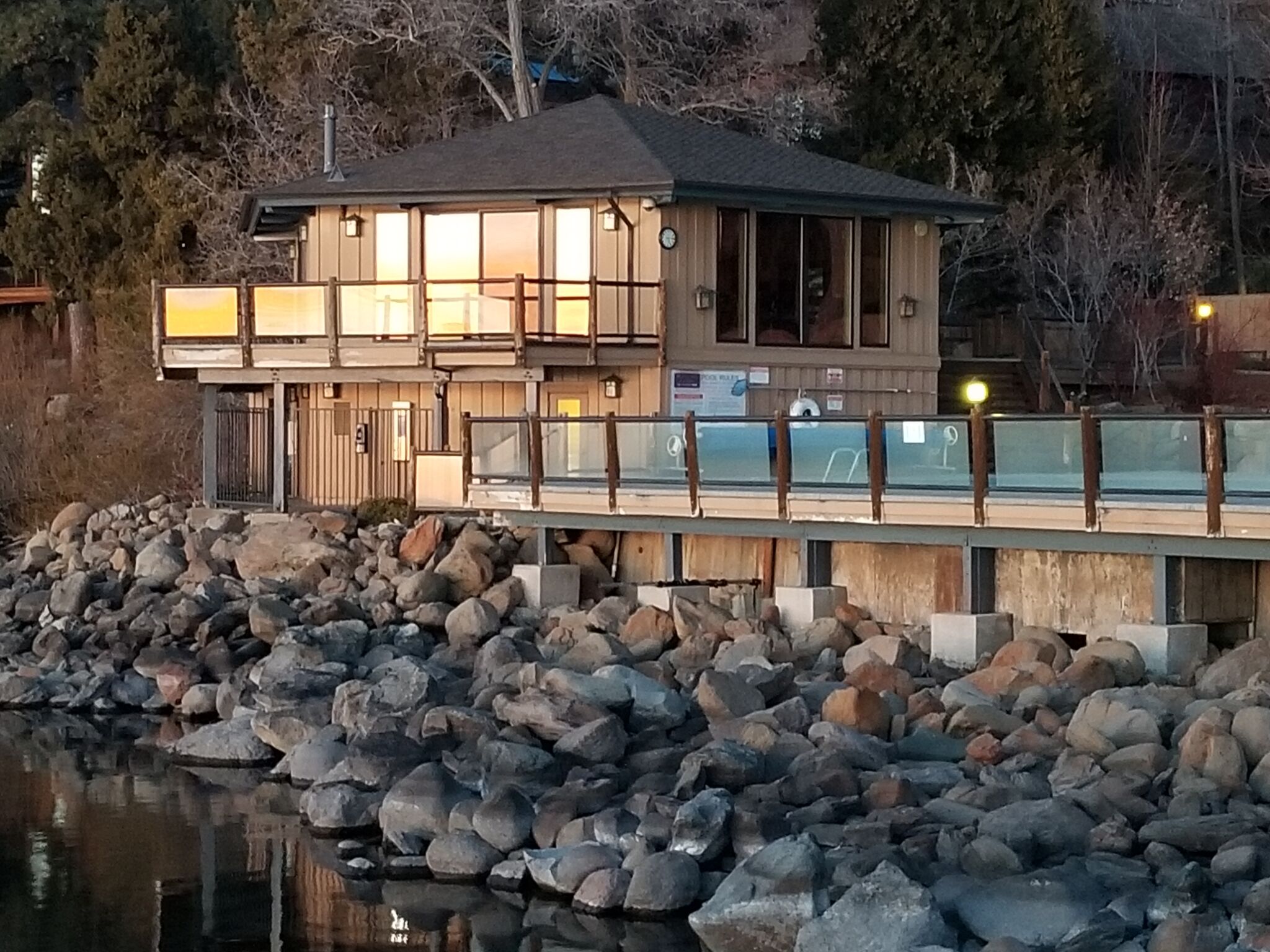 Sheltered in a swath of towering pine trees on Lake Tahoe's north shore is Brockway Springs Resort. Guests are invited to take a dip in the year-round swimming pool heated directly by natural hot springs while the kids frolic in the children's wading pool. Also available are two tennis courts, fishing and boating pier, and a clubhouse with saunas and a fitness room. A beautiful half-mile of wooded and level shoreline is perfect for leisurely evening strolls.