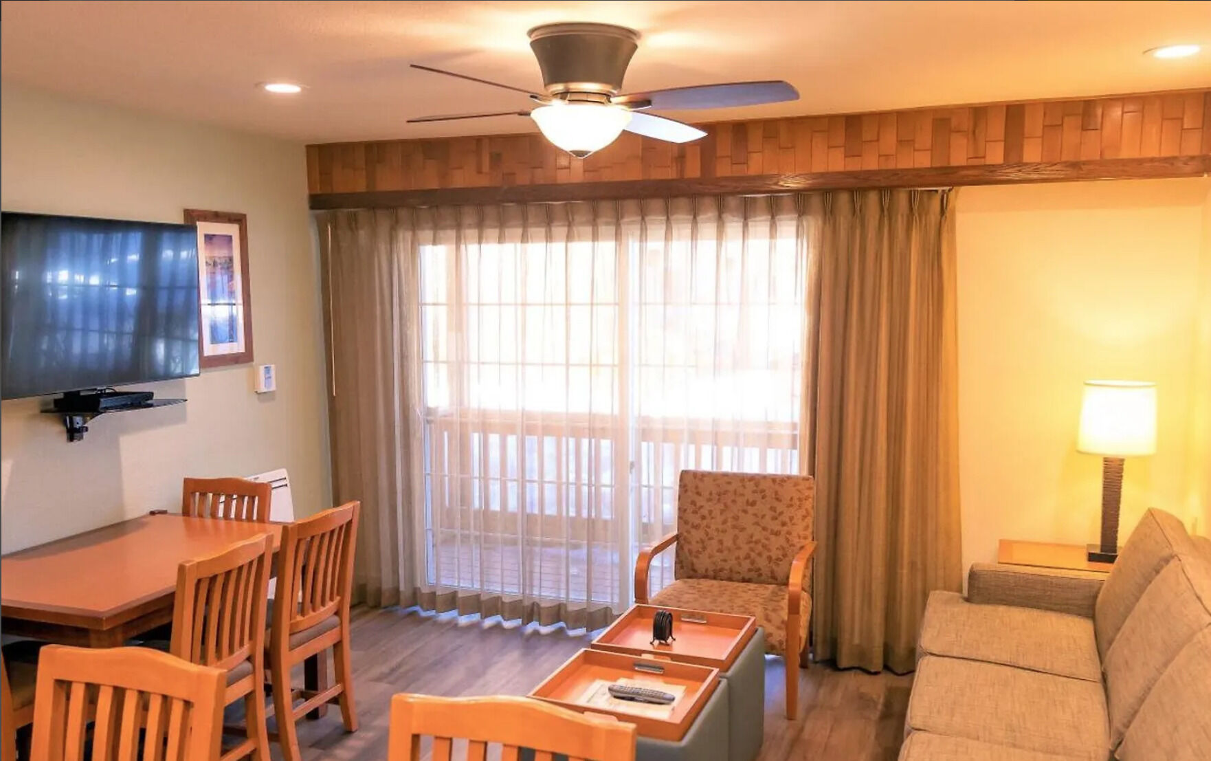 Tahoe Beach and Ski Club offers studio, one-bedroom, two-bedroom, and deluxe cabin accommodations. Studio units sleep two with a queen bed. One-bedroom units feature a king bed in the bedroom, a queen sleeper sofa in the living area, Jacuzzi tub, and a kitchenette. Two-bedroom units feature a king bed in the master bedroom, two double beds in the guest bedroom, a queen sleeper sofa in the living area, a kitchenette, and Jacuzzi tub. Cabins feature the same sleeping configuration as two-bedroom villas, but also include in-room washer and dryer, fully furnished deck, full kitchen and fireplace.