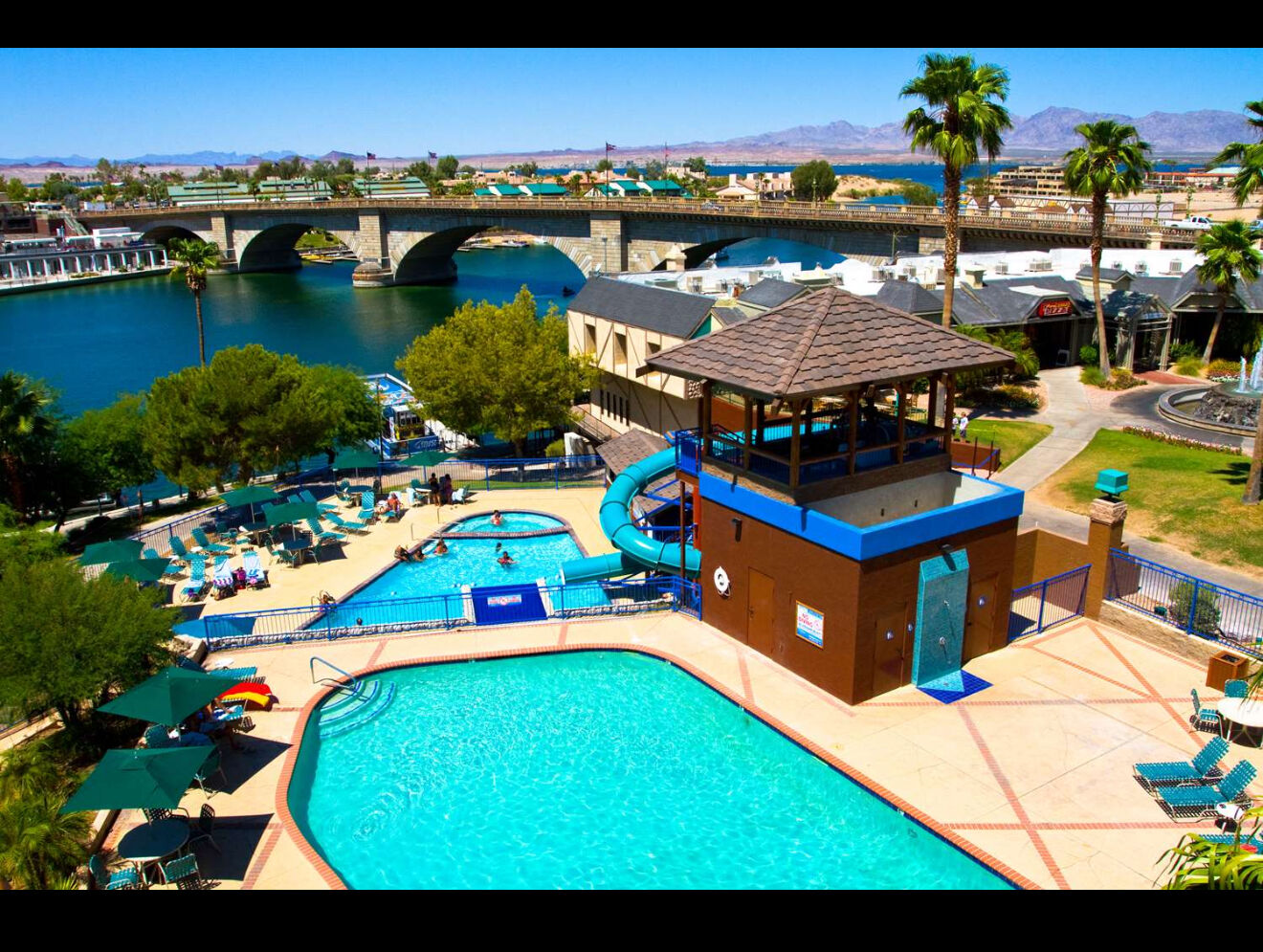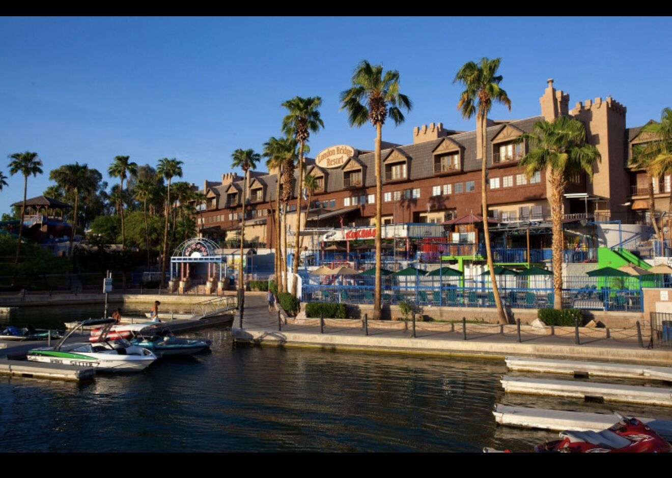 London Bridge Resort fuses English Tudor and contemporary design right along the shores of Arizona's magnificent Lake Havasu. Here, you'll find everything needed to enhance your Arizona vacation - London Bridge Resort features an on-site marina and boat dock, water activity equipment rentals, three pools and a whirlpool spa, a splash pool and a 94-foot waterslide, executive 9-hole golf course, The London Bridge Day Spa, three different restaurants/bars (including a poolside bar!), barbecue grilling area, daily activities and more!