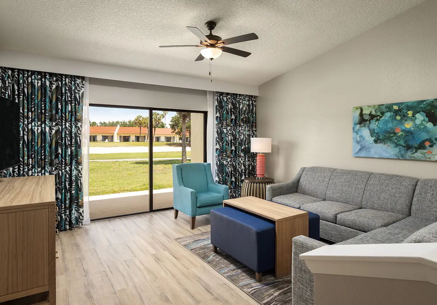 A variety of different units are available at the Holiday Inn Orange Lake North Village. Ranging from one to three bedrooms, they offer ample room for groups of four to twelve guests to relax after action-packed days. All are attractively furnished in rich, bold colors and offer amenities, comforts, and conveniences such as full kitchens, air conditioning, in-suite washer/dryer, telephones and more.