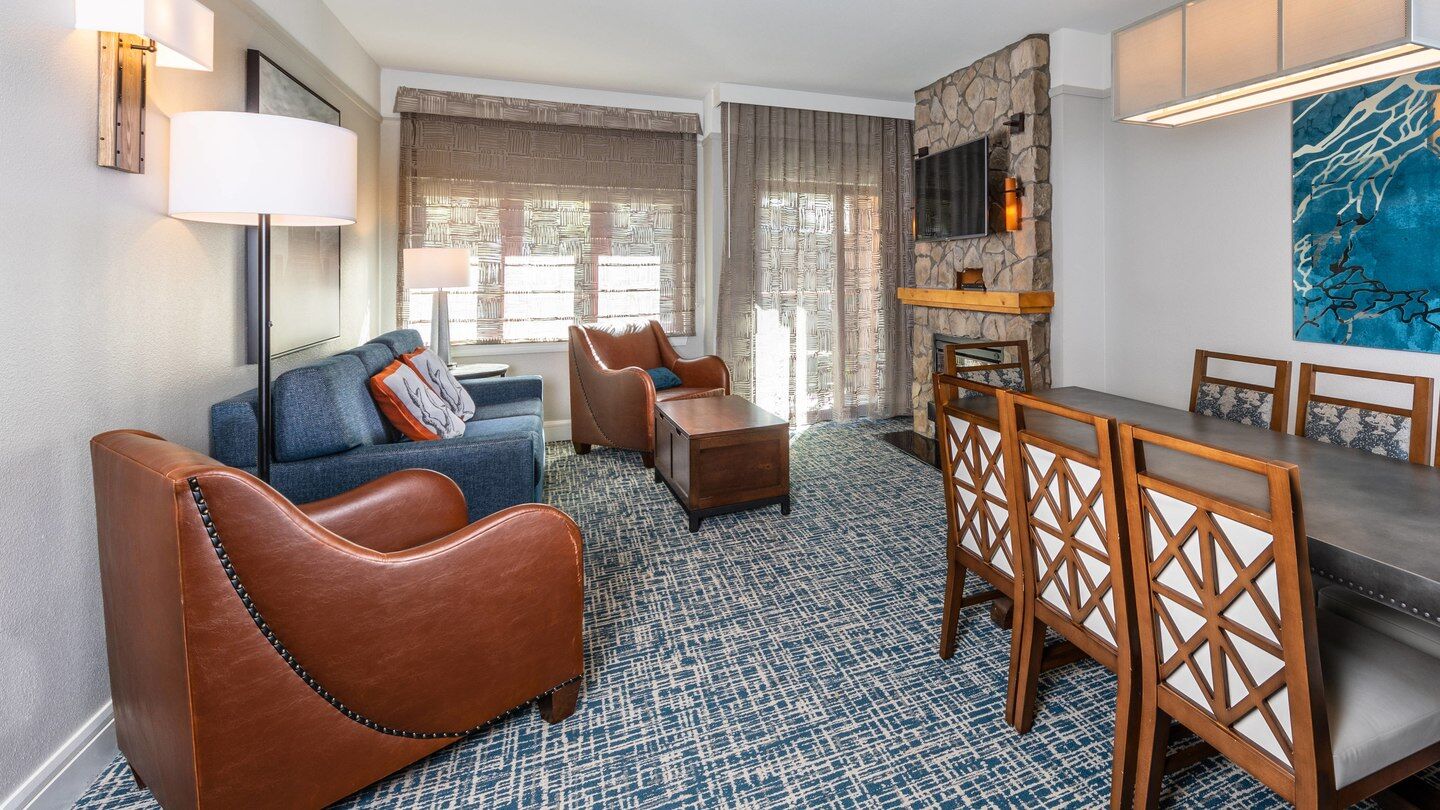 Marriott's Timber Lodge offers sophisticated one, two and three-bedroom villas complete with full kitchens, separate living and dining areas and in-room washer and dryer. Step out onto your villa's private balcony and enjoy the breathtaking views or head back inside to sit in, light a cozy fire and curl up in from of the flat-screen TV for a movie. Or, after a long day working your muscles on the slopes, take a dip in the whirlpool bathtub. Studio units are also offered if you're seeking smaller and more compact accommodations!