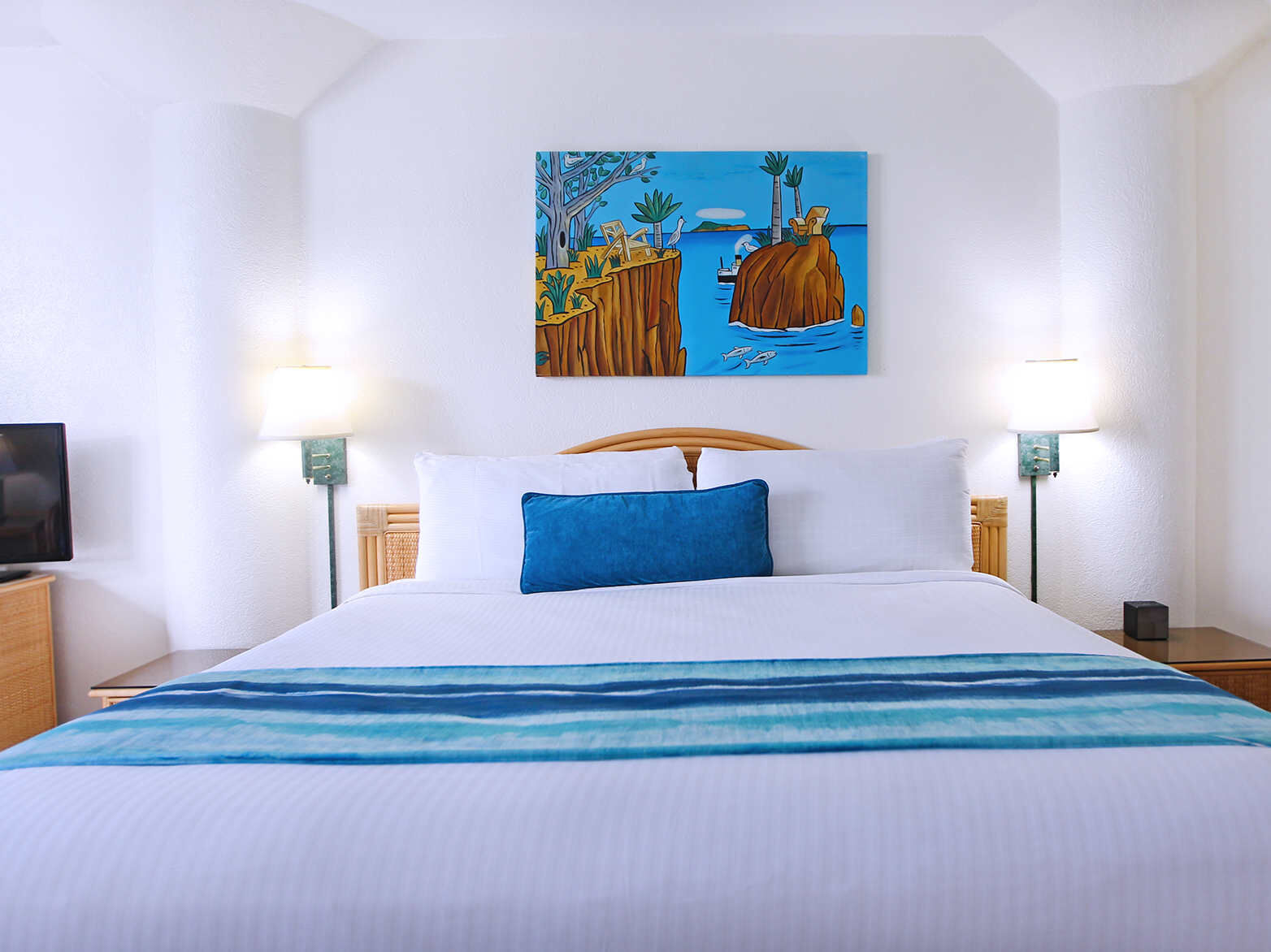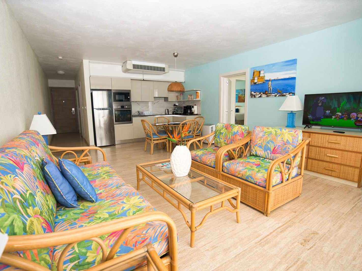 Over 100 suites range from studios to multi-bedroom units, each thoughtfully designed with fully equipped kitchens, private balconies with ocean or garden views, and modern conveniences like central air conditioning, high-speed internet, flat-screen TVs, and walk-in showers. Many units offer king-size beds in master suites and queen beds in additional bedrooms, making the resort well suited for couples, families, or groups. Interiors reflect relaxed Caribbean chic with Italian and tropical décor touches that feel vibrant yet welcoming.