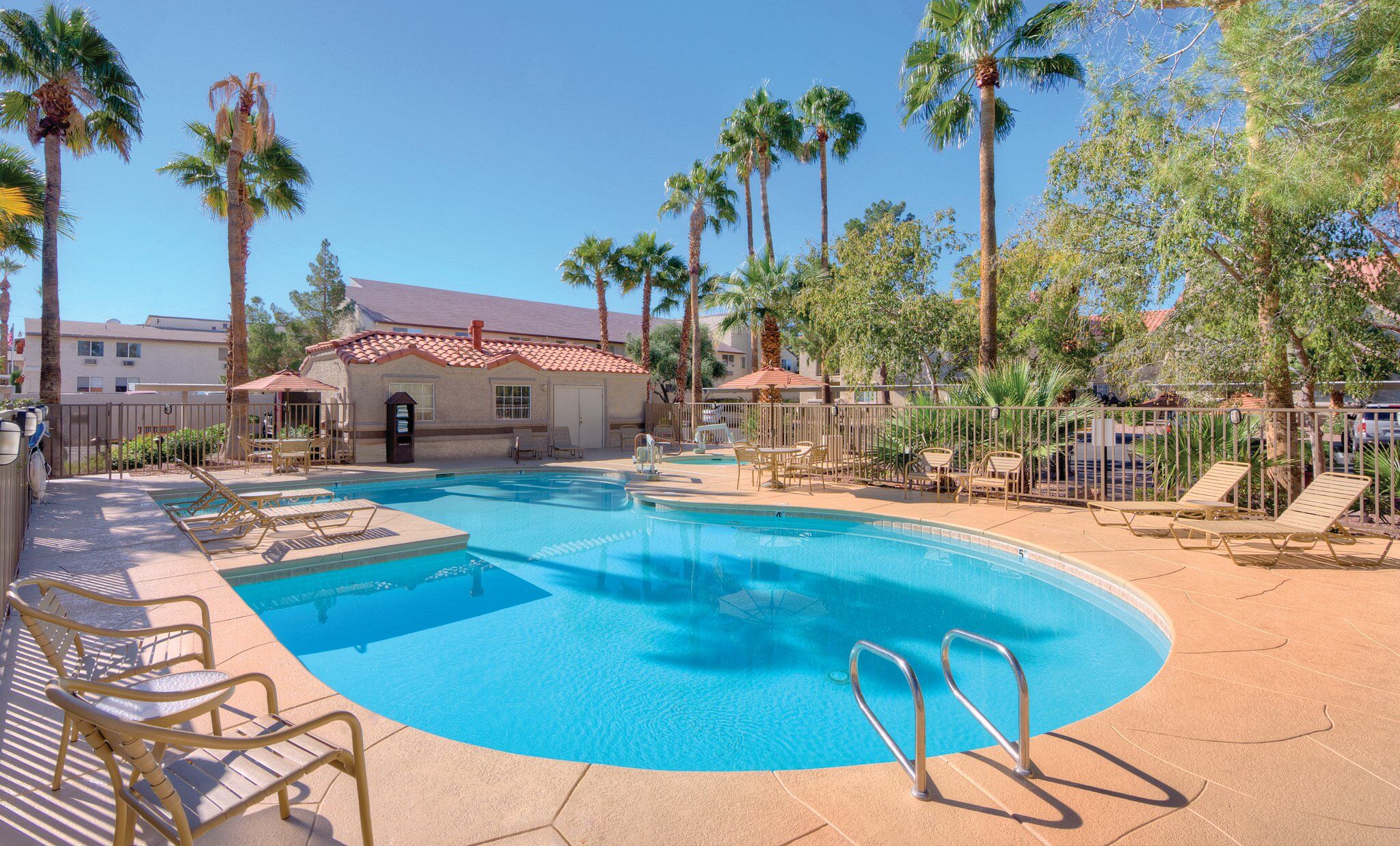 WorldMark Las Vegas on Spencer Street is a perfect retreat from the glitz of the Strip after a long day of touring the casinos, or a night of gambling. This resort offers one- and two-bedroom timeshare accommodations complete with a fully equipped kitchen with microwave and dishwasher, washer and dryer, gas fireplace, cable TV with VCR/DVD player, stereo system with CD player, and air conditioning. One- bedroom units sleep four with a king bed in the bedroom and a queen Murphy bed in the living area. Two-bedroom units sleep six with a king bed in the master bedroom, two twin beds in the guest bedroom, and a queen Murphy bed in the living area.