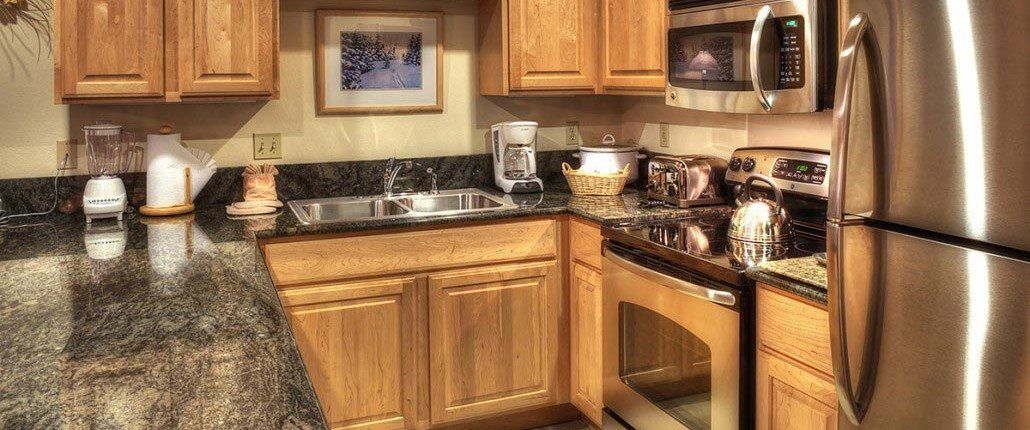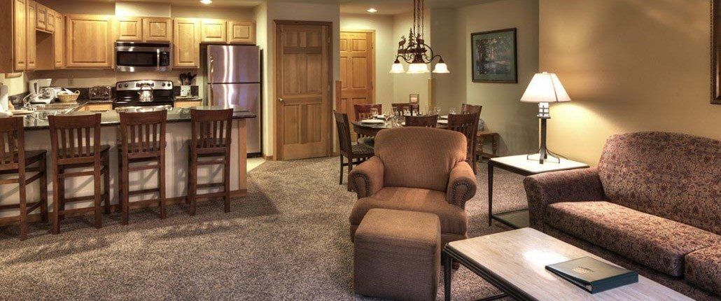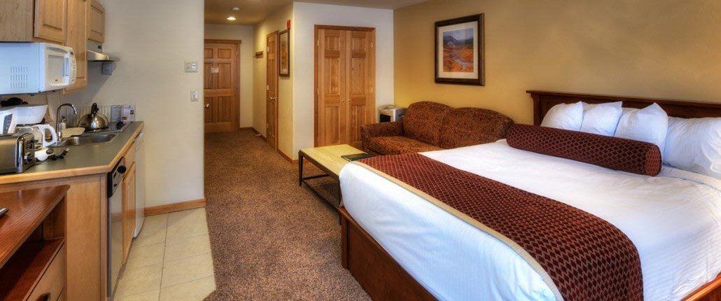 The one, two and three-bedroom suites at Grand Timber Lodge come outfitted with fully equipped kitchens, breakfast bar, dining area, private decks, fireplaces, whirlpool bathtubs, cable television with DVD player and in-suite washer and dryer. Studios unit are available for those just looking for the basics, offering a TV and DVD player, kitchenette and full bathroom.