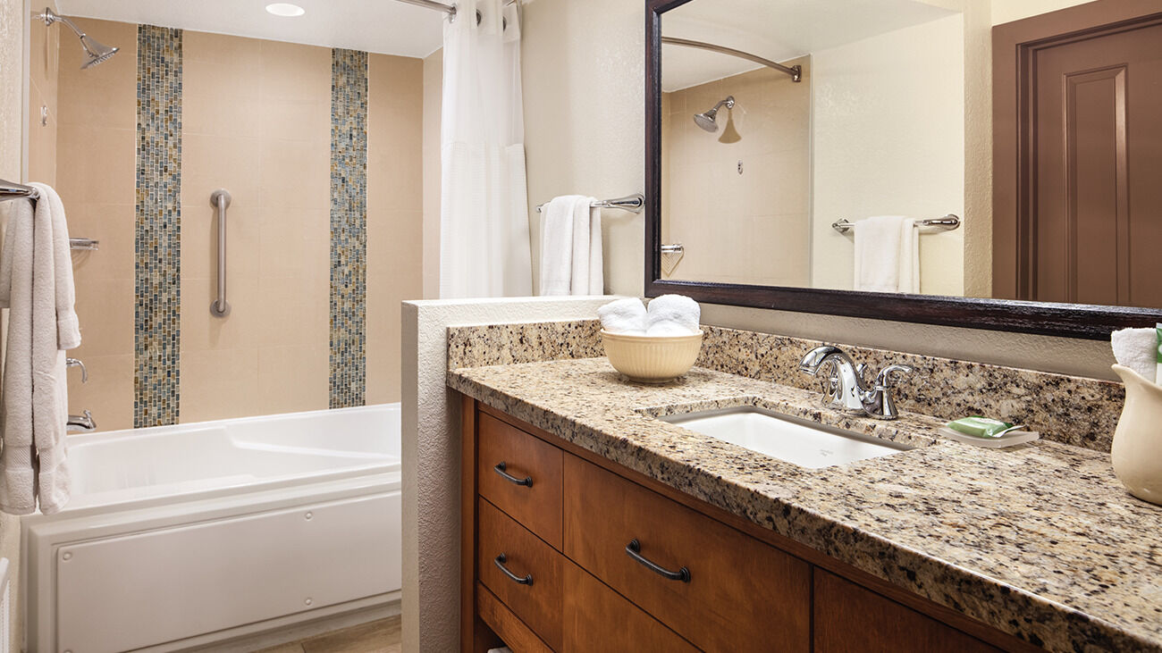 After a day of fun and thrills, return to your comfortable studio or villa. Enjoy all the conveniences of home, including living and dining areas, plus a fully equipped kitchen! All rooms also include a television with cable/satellite programming, DVD player in living area, whirlpool tub in select studios and all one- bedroom villas, fully furnished private balconies and porches and complimentary Wi-Fi access.
