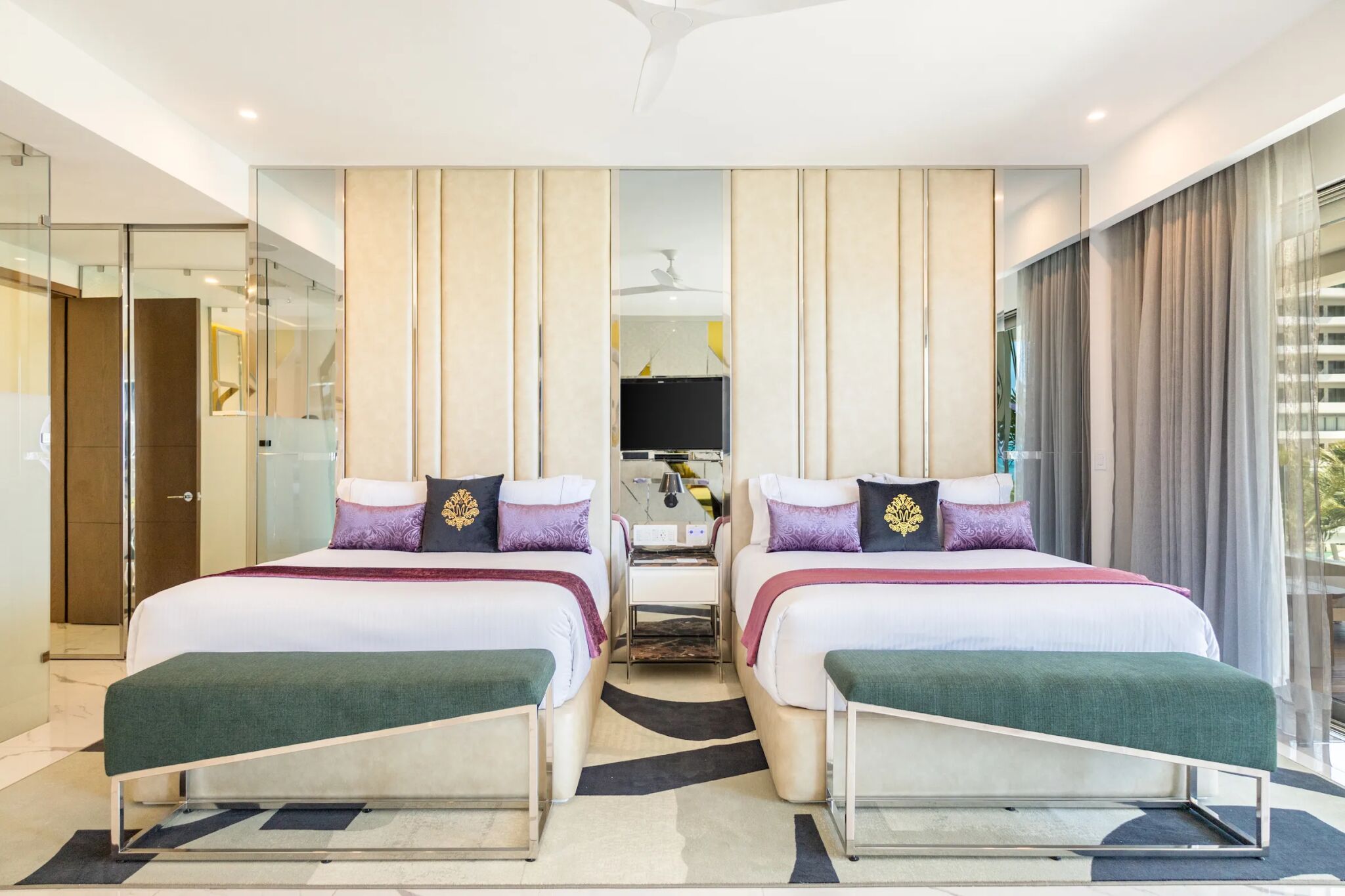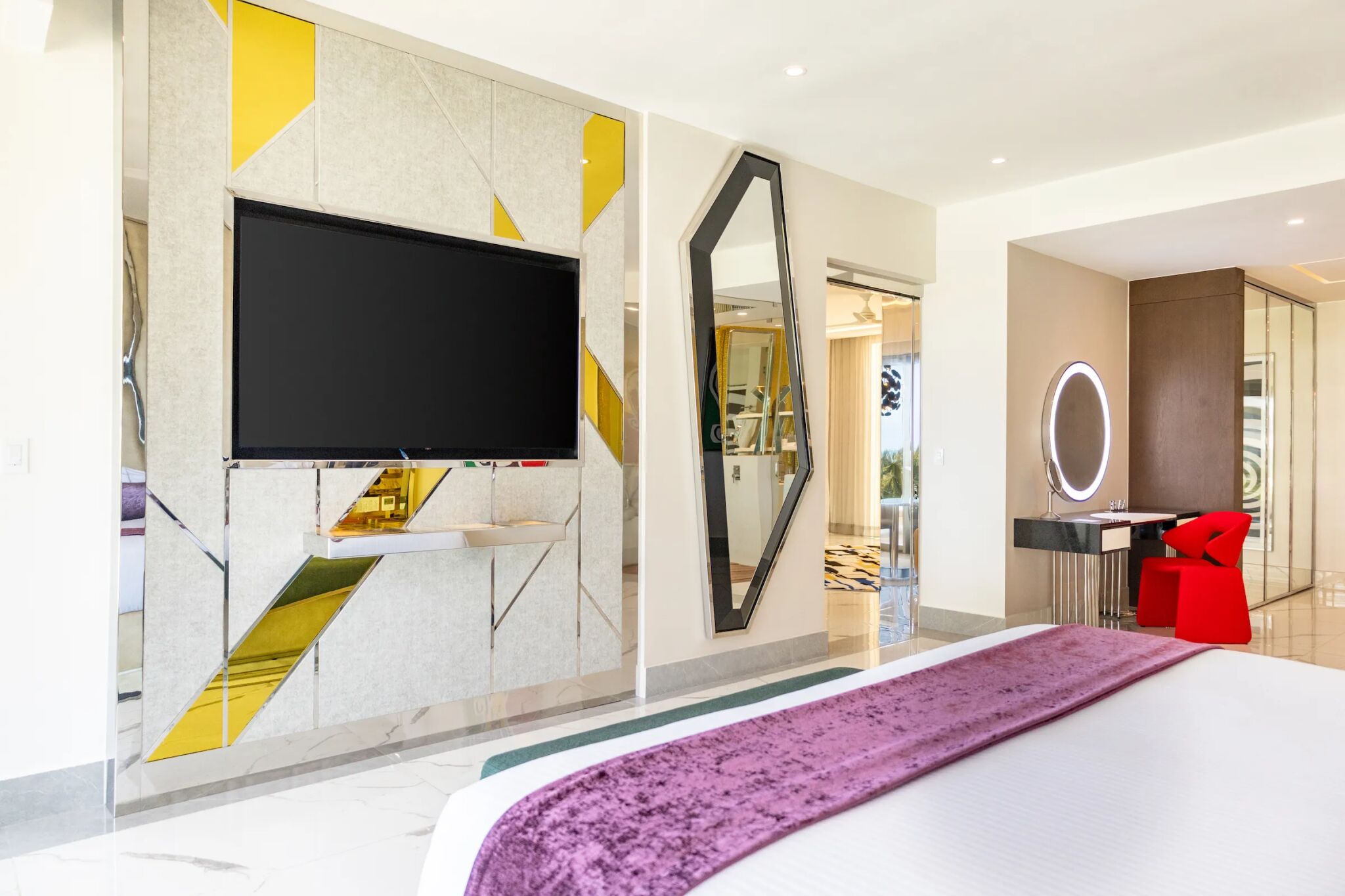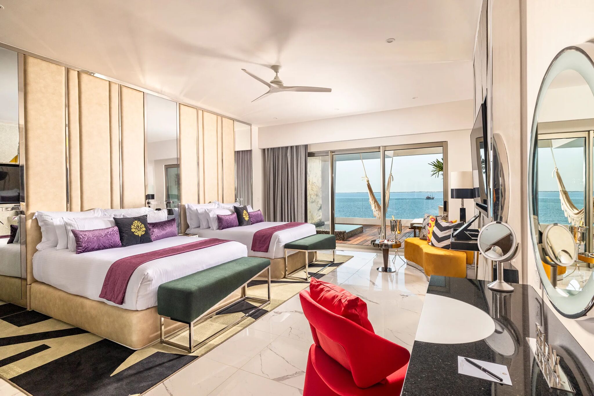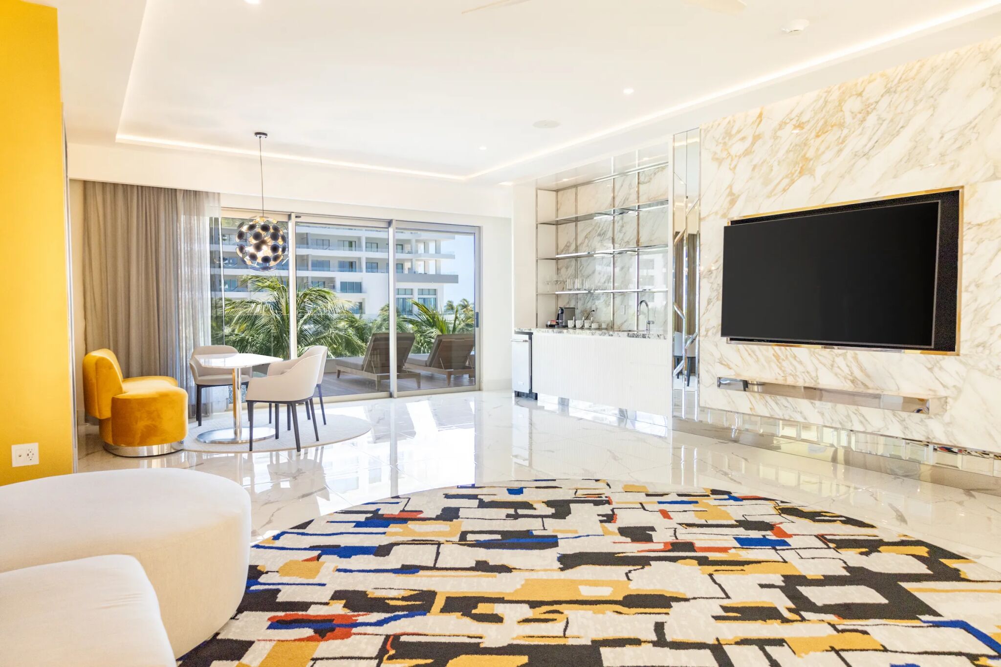 Accommodations span 88 spectacular suites - from Corner Suites with wrap-around terraces to the expansive Ultra Mousai Suites reaching over 2,000 sq ft - each outfitted with floor-to-ceiling windows, intelligent lighting and curtain controls, private Jacuzzis on spacious terraces, premium bedding, and plush technology amenities like smart-bidet toilets and iPad-integrated systems. Interiors combine bold modern design with muted sandy tones and vibrant accents, creating a chic yet inviting ambiance for couples or discerning travellers.