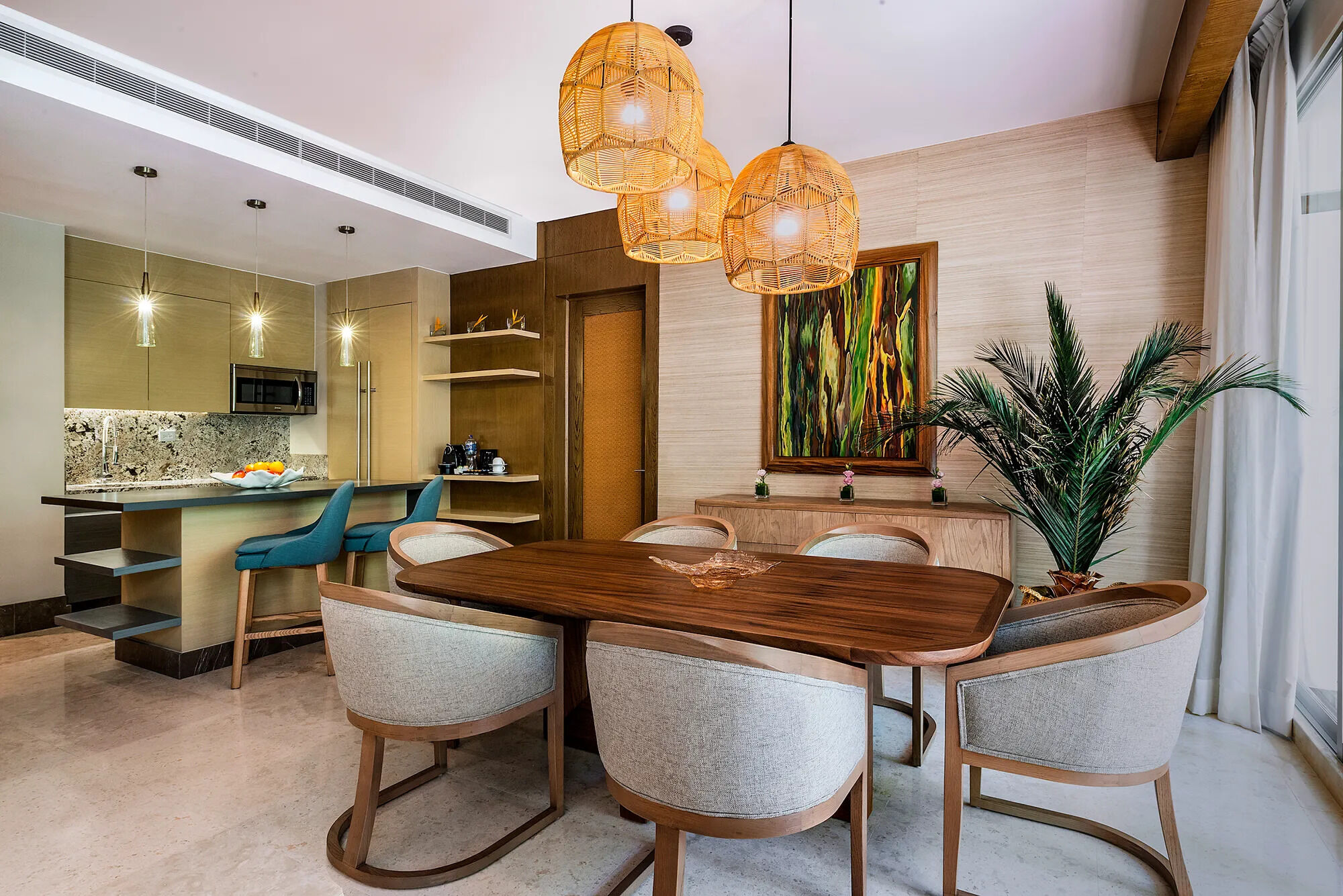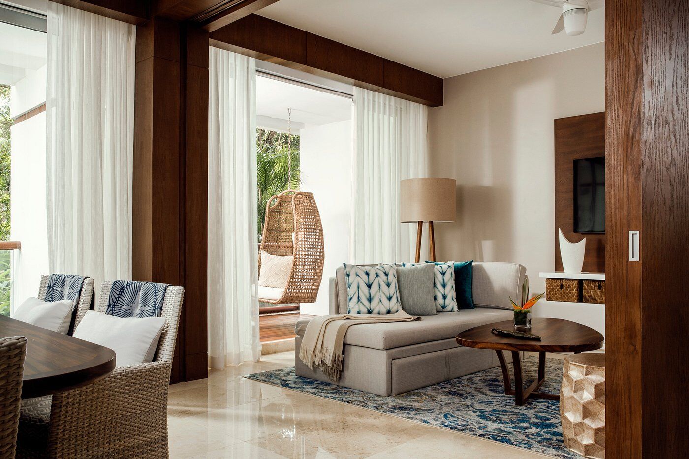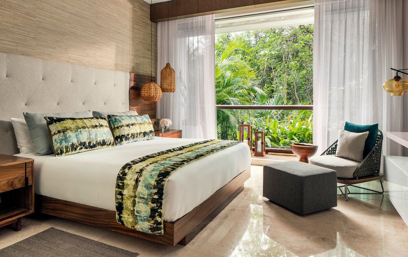 The accommodations at Grand Luxxe are spacious and designed for high comfort, offering villa-style suites across several layouts. Many units include gourmet kitchens, dining and living areas, private terraces with plunge pools, multiple bathrooms with marble finishes and Jacuzzi tubs, and sweeping views of jungle or sea. The décor blends natural materials, neutral tones, and elegant modern finishes to create a serene retreat. Recent additions such as the Jungle Suites add secluded floor plans and elevated design touches for guests seeking a more intimate feel.