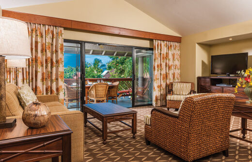 At Wyndham Kona Hawaiian Resort, you'll be relaxing in style in your two-Bedroom, two bathroom suite that overlooks tropical plants and colorful flowers. The master bedroom features a roomy king bed and whirlpool tub while the second bedroom boasts a comfy king. A separate living room beckons with a queen sleeper sofa, cable television, and DVD player. There's also an open air lanai and a fully equipped kitchen. Bamboo, teak, wicker, floral fabrics, and Hawaiian art add classic Hawaiian charm to the interior.