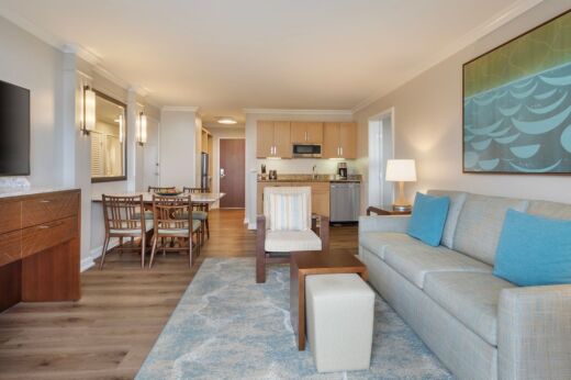 This one-bedroom suite has a king bed in a private bedroom, and a sofa bed in the main living space.