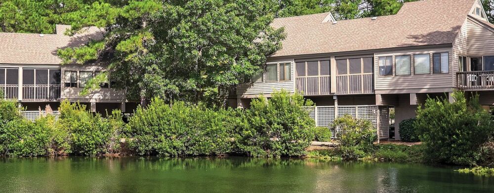 The Neuse River of eastern North Carolina is home to this resort. The villas, with two bedrooms plus a loft, provide an open-air deck which overlooks a private lake. Fully equipped kitchens, a whirlpool, and tastefully decorated living rooms contribute to a pleasant stay. Two outdoor swimming pools, 11 tennis courts, a miniature golf course, and a recreation center which houses an indoor swimming pool are just a sampling of the amenities at the resort.