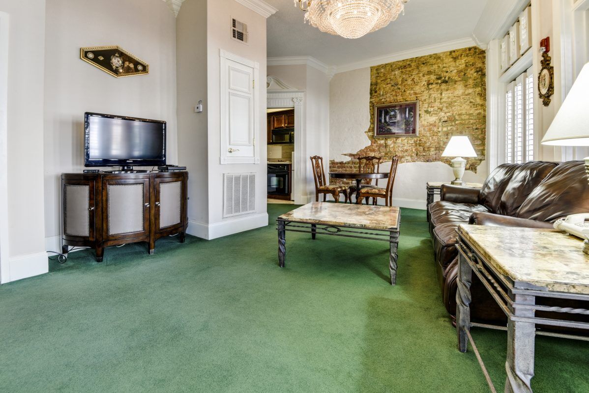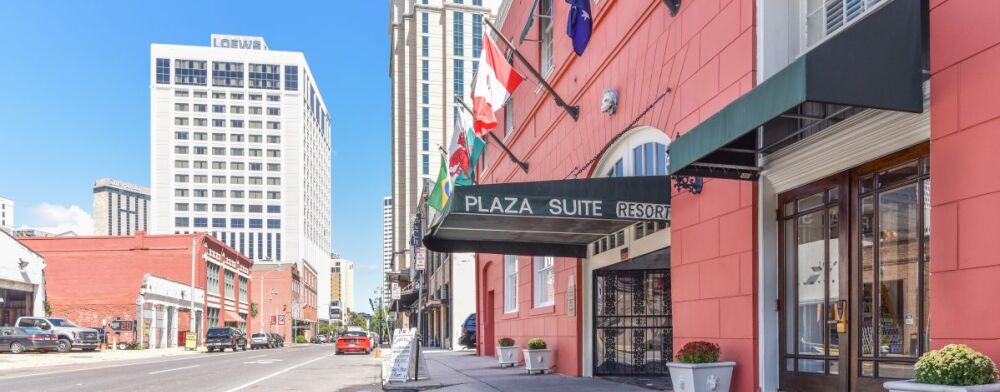 The Plaza Suite Hotel Resort is located 2.5 blocks from the French Quarter, Aquarium of the Americas, and the Riverwalk for shopping, dining, music, and other cultural attractions. The resort has a hot tub area, a unique glass-enclosed atrium area on the second floor and 24- hour security gates.