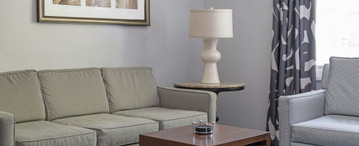 A one-bedroom deluxe suite with a full bed in the bedroom and a sofa bed in the living area.