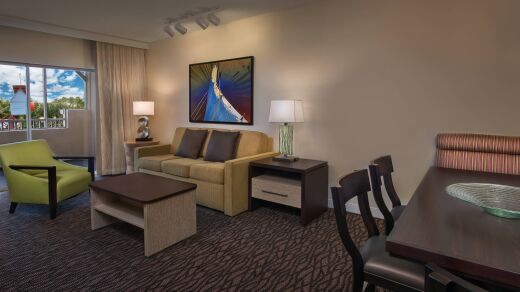 This one-bedroom villa provides a king bed in a private bedroom and a sleeper sofa in the common living area. Furniture and decor may vary.