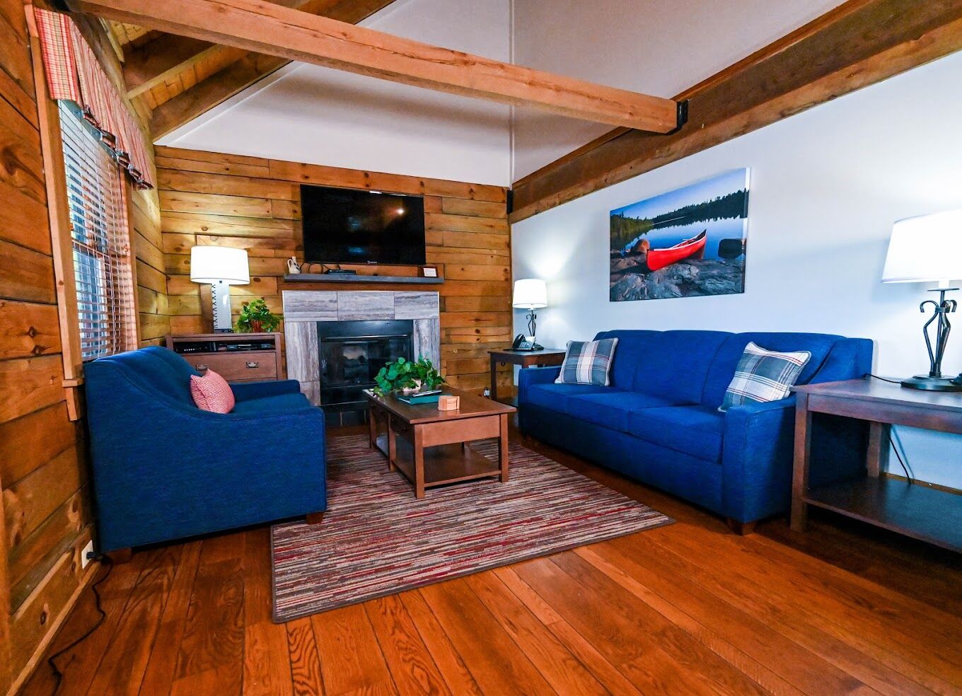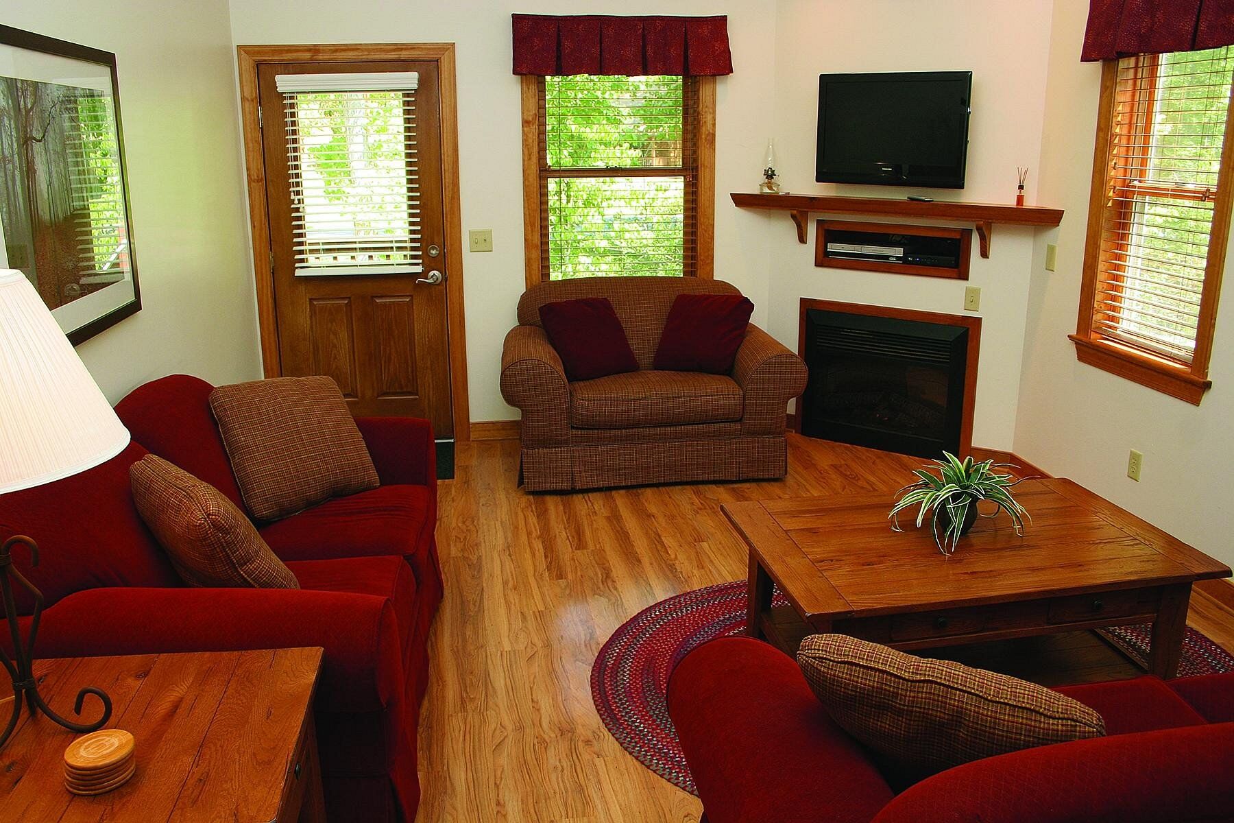 Each unit features a living room and dining area, full kitchen with microwave and dishwasher, fireplace, cable TV/VCR, and private patio deck.