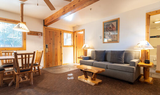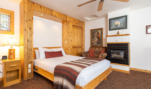 Red Wolf Lakeside Lodge offers studio, one and two-bedroom suites. Studio units sleep two and feature one bathroom, a queen Murphy bed, and kitchenette with dishwasher, microwave and refrigerator. One-bedroom units sleep four and feature one bathroom, a queen bed in the bedroom, a queen sleeper sofa in the living area and a kitchenette. Two-bedroom units sleep six and feature two bathrooms, a queen bed in both bedrooms and a full size kitchen. Of course, each room is decked out with warm woods and alpine theming to capture the Tahoe spirit.