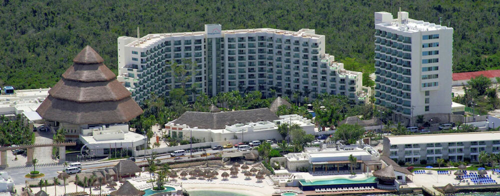 This mandatory all-inclusive resort is just 10 minutes from the Cozumel International Airport and 5 minutes from downtown San Miguel. Lush and expansive gardens surround the 10 story Mayan-style stone work building and large free-form swimming pool. A private underpass leads to a natural secluded beach. Spacious rooms offer individually controlled air conditioning, satellite color TV, direct dial telephone and private balcony with ocean or ocean and garden/pool view. Hotel amenities include a children pool with water slide, 3 lighted tennis courts, fitness room, a Children Club as well as 2 restaurants, 2 snack bars and 3 bars to choose from. Non motorized water sports are free while motorized water sports are available for a fee. Enjoy the 7 different evening shows and the organized daily activities.
