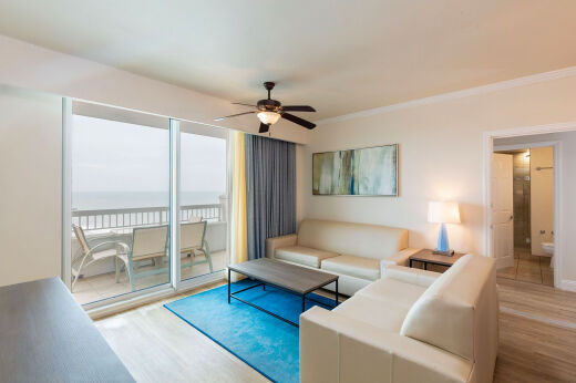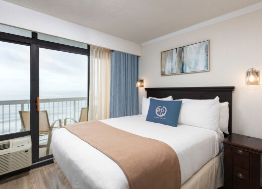 Accommodations range from oceanfront guestrooms to one- and two-bedroom villas, many with furnished balconies that offer views of the ocean or the nearby amusement park. Rooms include two queen beds or king-bed layouts (depending on room type), cable TV, Wi-Fi, air conditioning/heating, kitchenettes or full kitchens in larger villas, and comfortable living/dining areas in multi-room units. Some villas feature amenities like jetted tubs and separate living spaces to better suit family stays.
