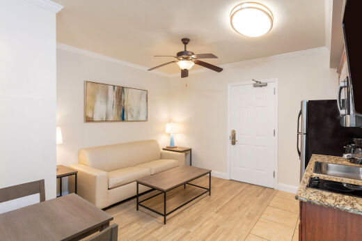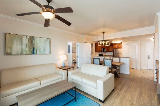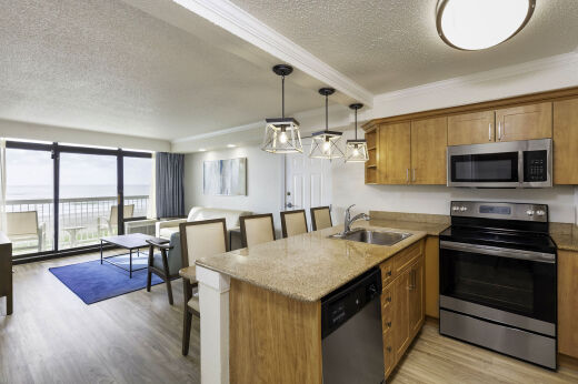 The One-Bedroom Deluxe Villa creates a remarkable environment, offering all the comforts of a beach home away from home for an unforgettable Myrtle Beach vacation getaway. Each villa features a king bed in a private bedroom and queen sleeper sofa in the main living area, as well as a full kitchen.