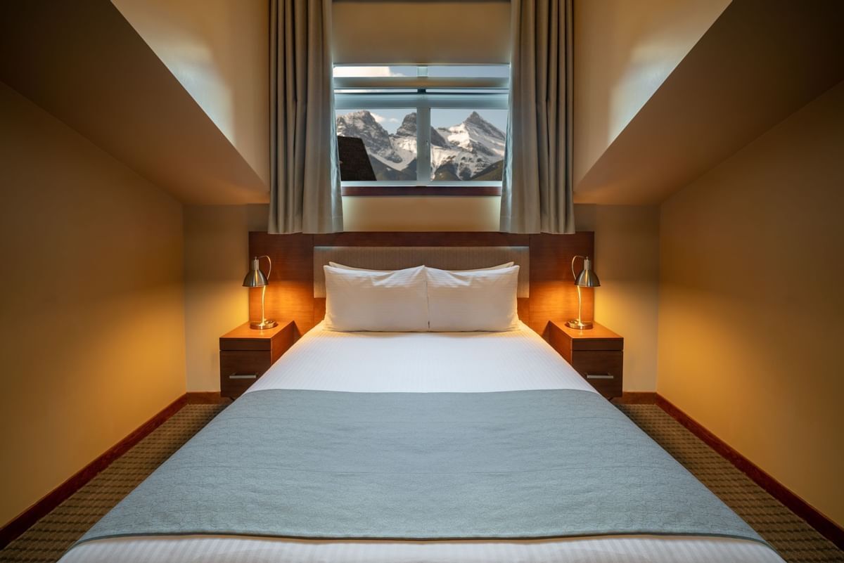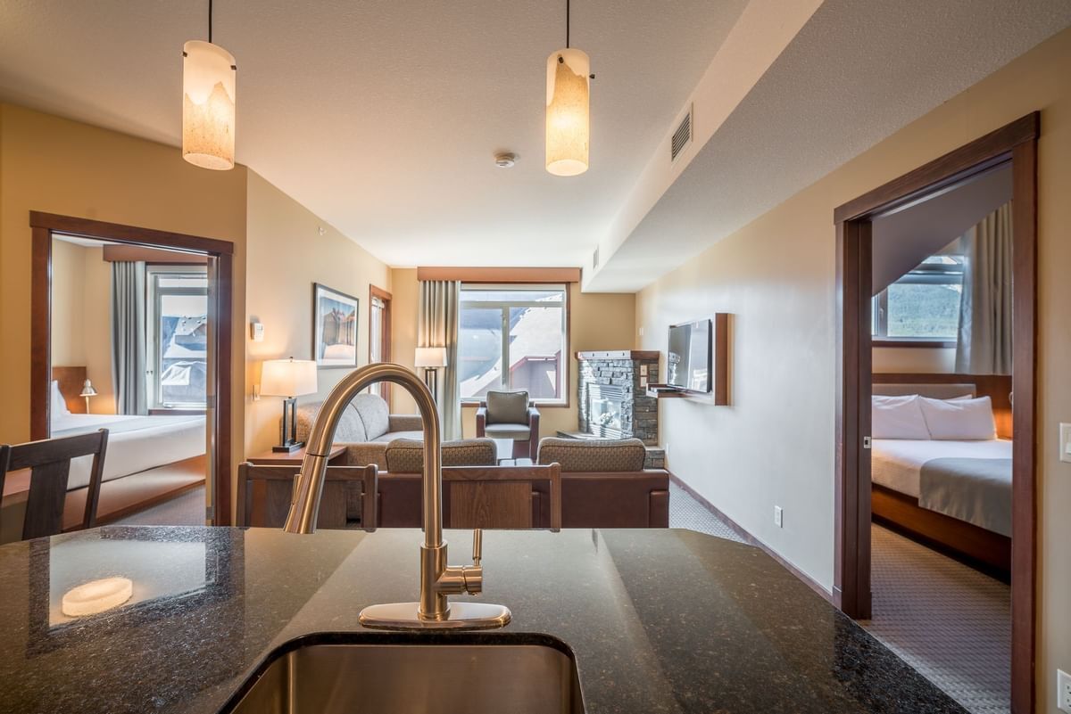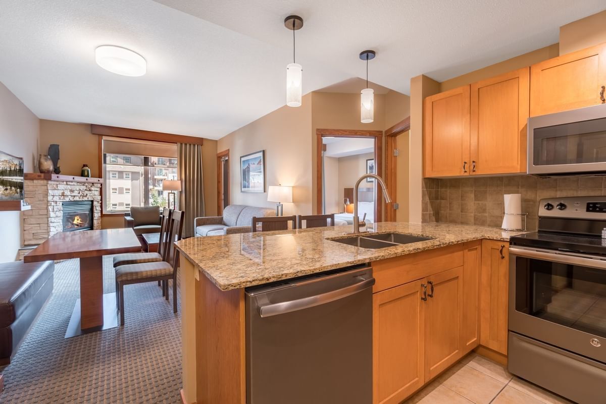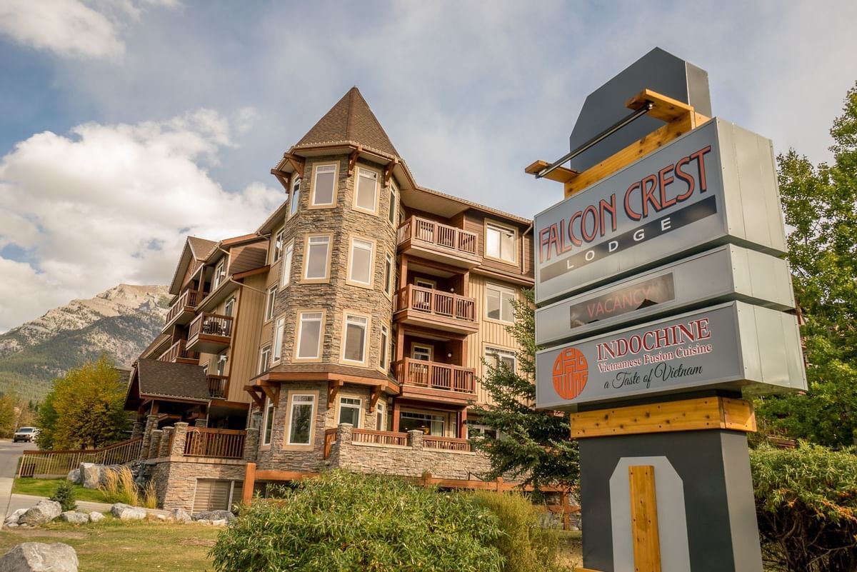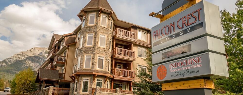 Studio timeshare units at Elkhorn at Falcon Crest sleep four with a double bed and sleeper sofa. Each unit is equipped with a fireplace, TV with DVD player, kitchen with mini refrigerator and microwave, and a private deck. Resort amenities include two outdoor hot tubs, workout room, heated underground parking, banquet room with veranda, and two on-site restaurants.