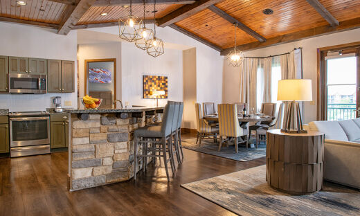 Wyndham Vacation Resorts at Glacier Canyon boasts one-bedroom, two-bedroom, three-bedroom and four-bedroom units, eighteen of which are lavish penthouse-style Presidential Suites. All units are fully furnished with cozy gas fireplaces, in-suite washer and dryer, full kitchen, whirlpool bathtub, full living and dining areas and more! Natural trims like rustic wood, stone and marble lend a wild and adventurous ambiance to each unit.