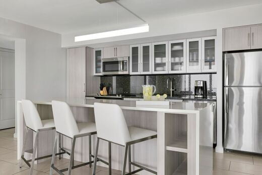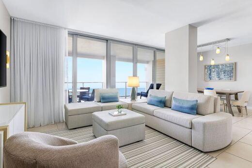 The sophisticated accommodations at Marriott's Crystal Shores offer spacious two- and three-bedroom villas designed for ultimate Florida coastal living. Each thoughtfully appointed vacation villa features a fully-equipped gourmet kitchen, separate living and dining areas, and a private furnished balcony perfect for enjoying spectacular Gulf sunsets. Master suites include luxurious king beds and spa-inspired bathrooms with oversized soaking tubs, while guest bedrooms provide comfortable queen beds. Modern amenities include complimentary high-speed Wi-Fi, flat-screen TVs, washer/dryer, and sleek contemporary furnishings with coastal accents - creating an elegant retreat for up to eight guests just steps from the beach.