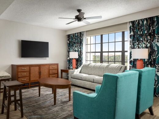 The spacious air-conditioned villas at the Orange Lake Resort - East Village are spacious and comfortable, the perfect retreat after a long day of activity. These colorful and airy villas feature amenities such as full or partial kitchens, a dining room and living room area, and a satellite TV with DVD player. Every villa is also furnished with a patio or balcony, many of which overlook the golf course. The villas range in size, from studios to three-bedroom units, and can sleep two to twelve guests depending on which configuration you opt for.