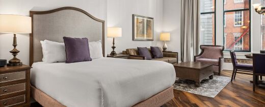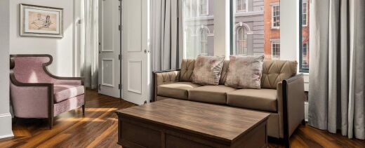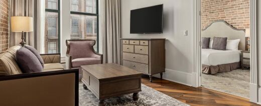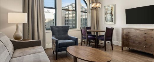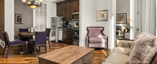The resort's distinctive accommodations feature spacious vacation condos with elegant separate living and dining areas, creating an upscale home-away-from-home atmosphere that reflects the grandeur of historic New Orleans. Each thoughtfully designed unit includes modern conveniences such as partial and full kitchens, air conditioning, and complimentary Wi-Fi throughout the property. The beautifully appointed suites showcase the property's remarkable Romanesque architecture and historic charm, while providing contemporary comfort and luxury amenities that cater to extended stays with weekly housekeeping service for extended visits.