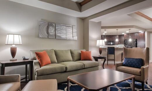 A one-bedroom deluxe suite with a king bed in the bedroom and a sofa bed in the living area.