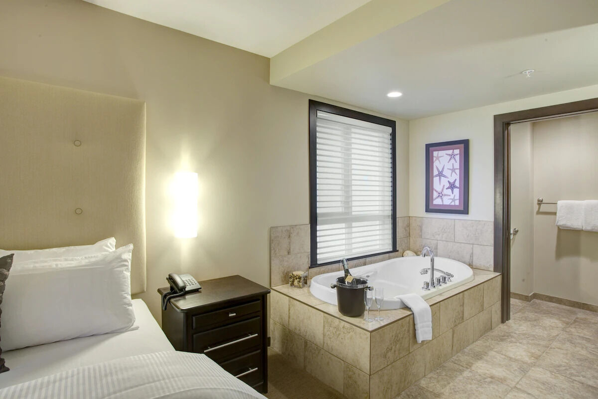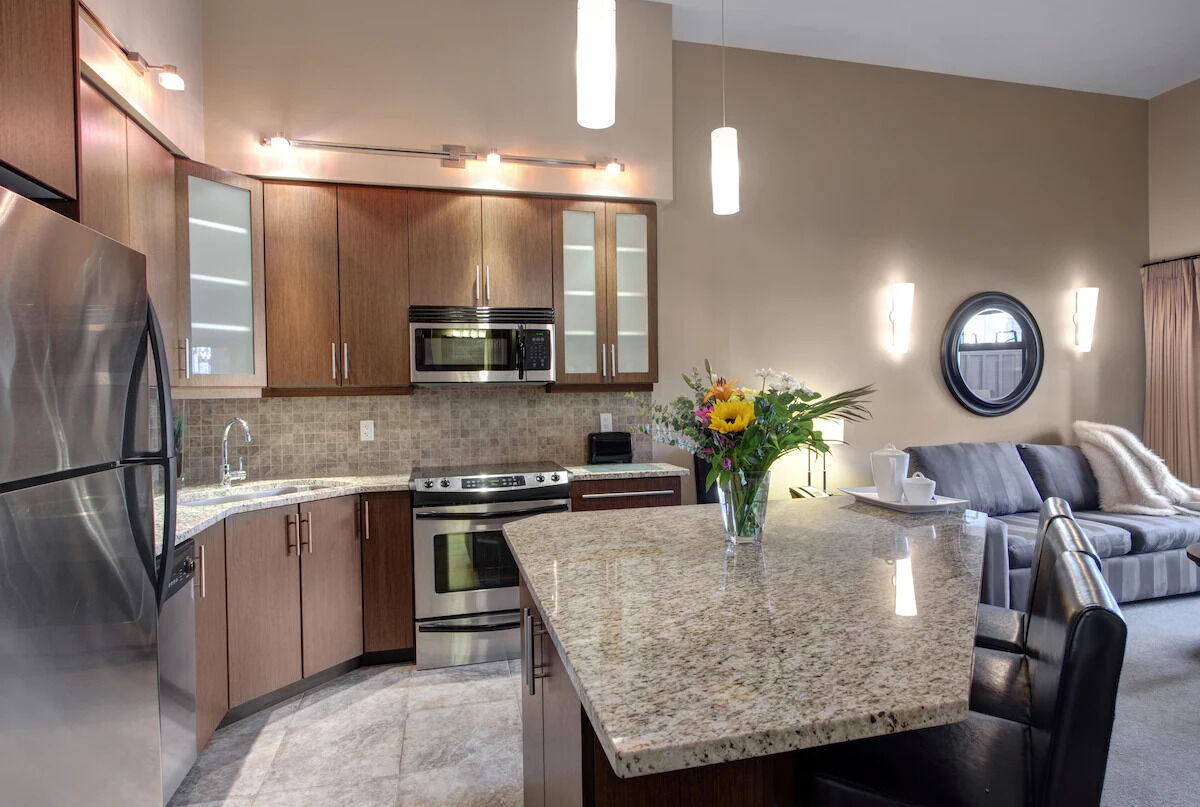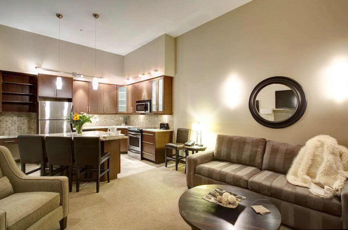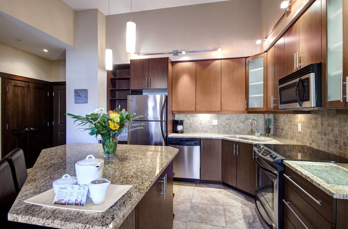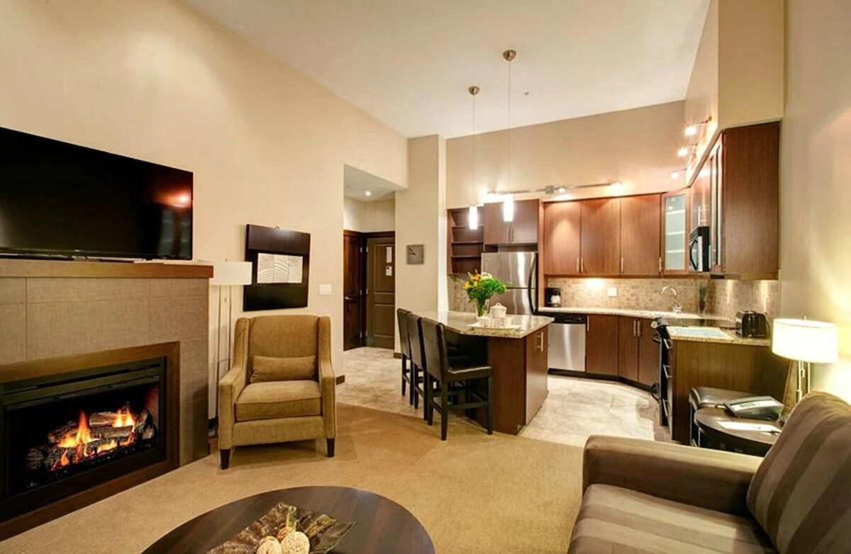 Sunrise Ridge's rooms come with everything you need to make the most of your trip. Full kitchens with granite countertops, heated tile flooring and stainless steel appliances making cooking your favorite meals easier than ever. Add to that a separate dining area, fireplace, soaker tub, heated bathroom floors, TV's, complimentary Wi-Fi, Bath & Body Works bath products and a starter pack of Starbucks coffee. Unit sizes ranging from a studio to a three-bedroom provides accommodations for almost any size group.