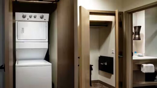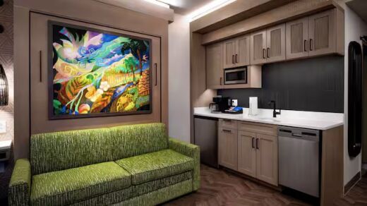 A compact Studio Duo unit that includes a queen Murphy bed and kitchenette.