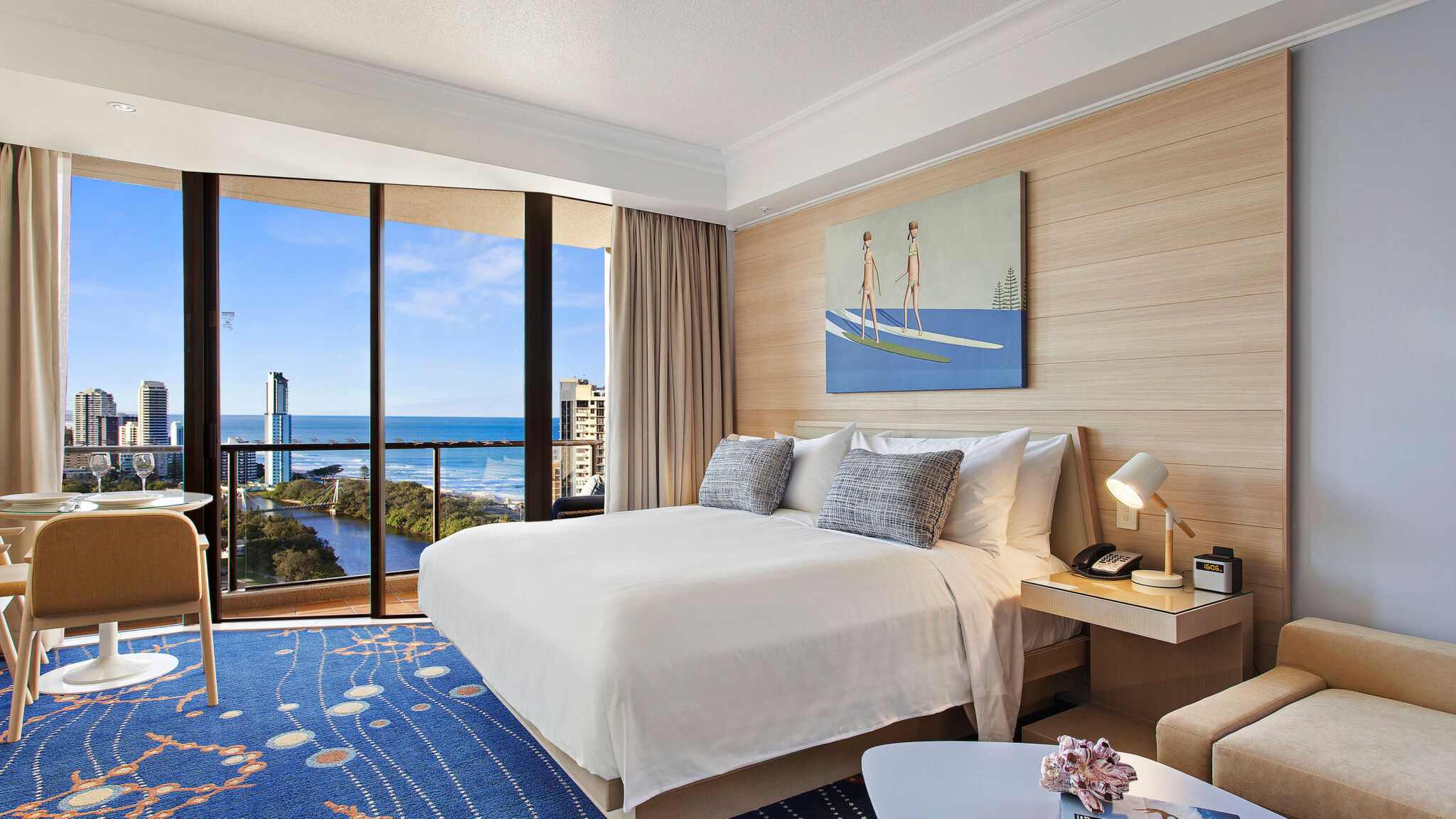 Marriott Vacation Club at Surfers Paradise offers both guest rooms and suites, all which are outfitted with luxurious bedding featuring down comforters, custom duvets and cotton-rich linens. Each room provides a private balcony with awe-inspiring views, many of which show off the beach itself! Units also include a kitchenette, marble bathrooms and complimentary Wi-FI to stay connected.