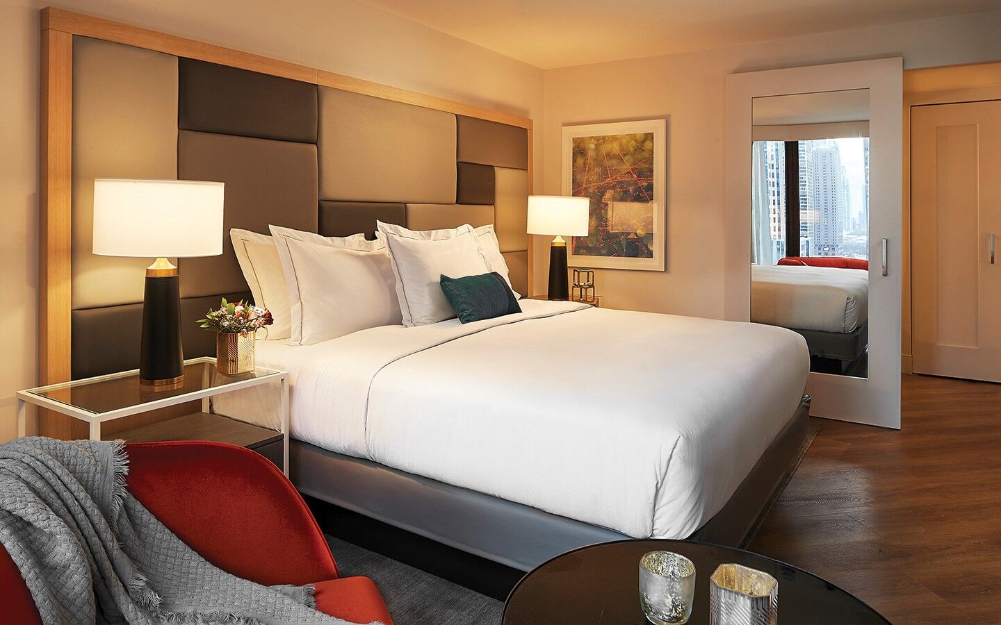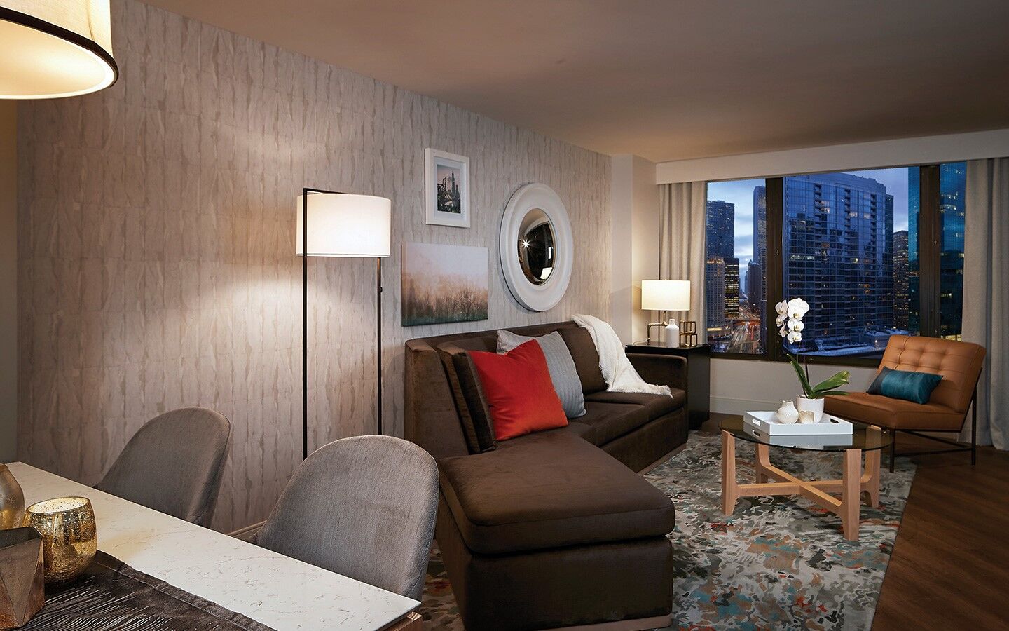 Hilton Grand Vacations Chicago Downtown Magnificent Mile offers sleek, contemporary guest rooms and one-bedroom suites. Guest rooms offer a king-sized bed, small sectional sofa, 55-inch HDTV and mini-refrigerator. Suites offer even more room to relax, and include a living room with queen sofa bed and dining table with four chairs. Regardless of what size you opt for, all rooms feature modern decor and complimentary Wi-Fi. Many rooms also offer beautiful views of downtown Chicago.