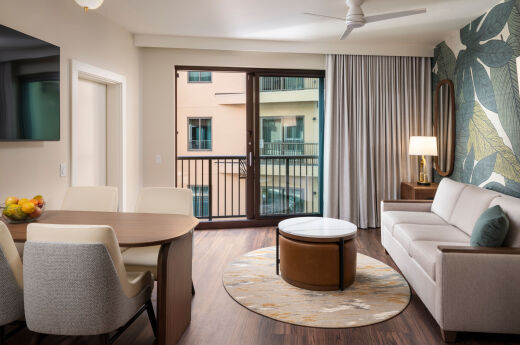At Marriott Vacation Club, Waikiki, guests have their choice of studio units or one-bedroom suites. Studio units sleep four and come equipped with a king bed and sofa bed, as well as a kitchenette. One-bedroom suites offer a bit more room to spread out, with a dedicated living area, dining area and kitchenette. One-bedroom suites sleep up to four guests, including either a king bed or two full beds, as well as a sofa bed in the living area.