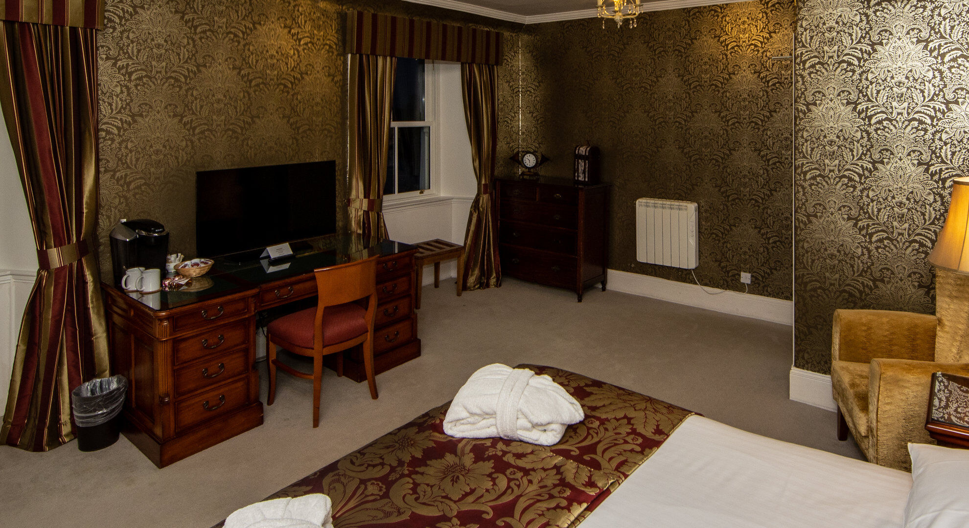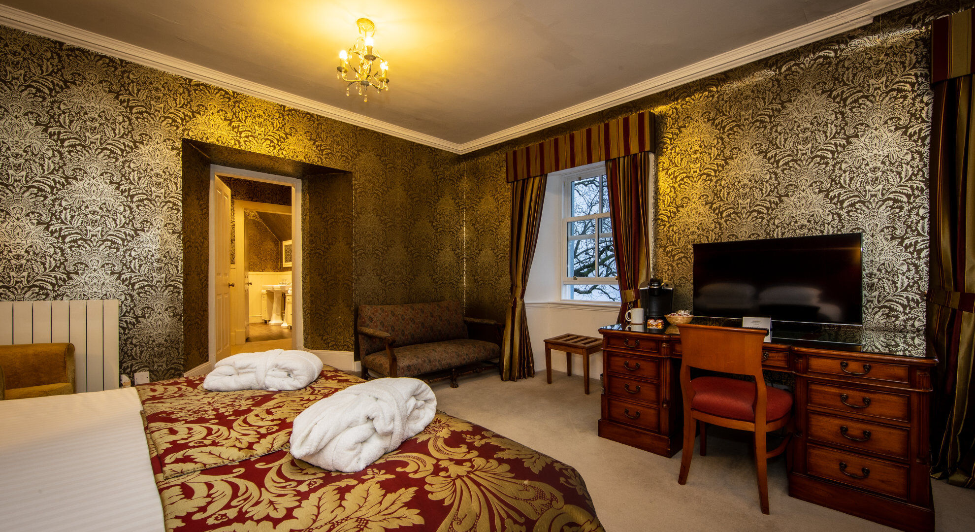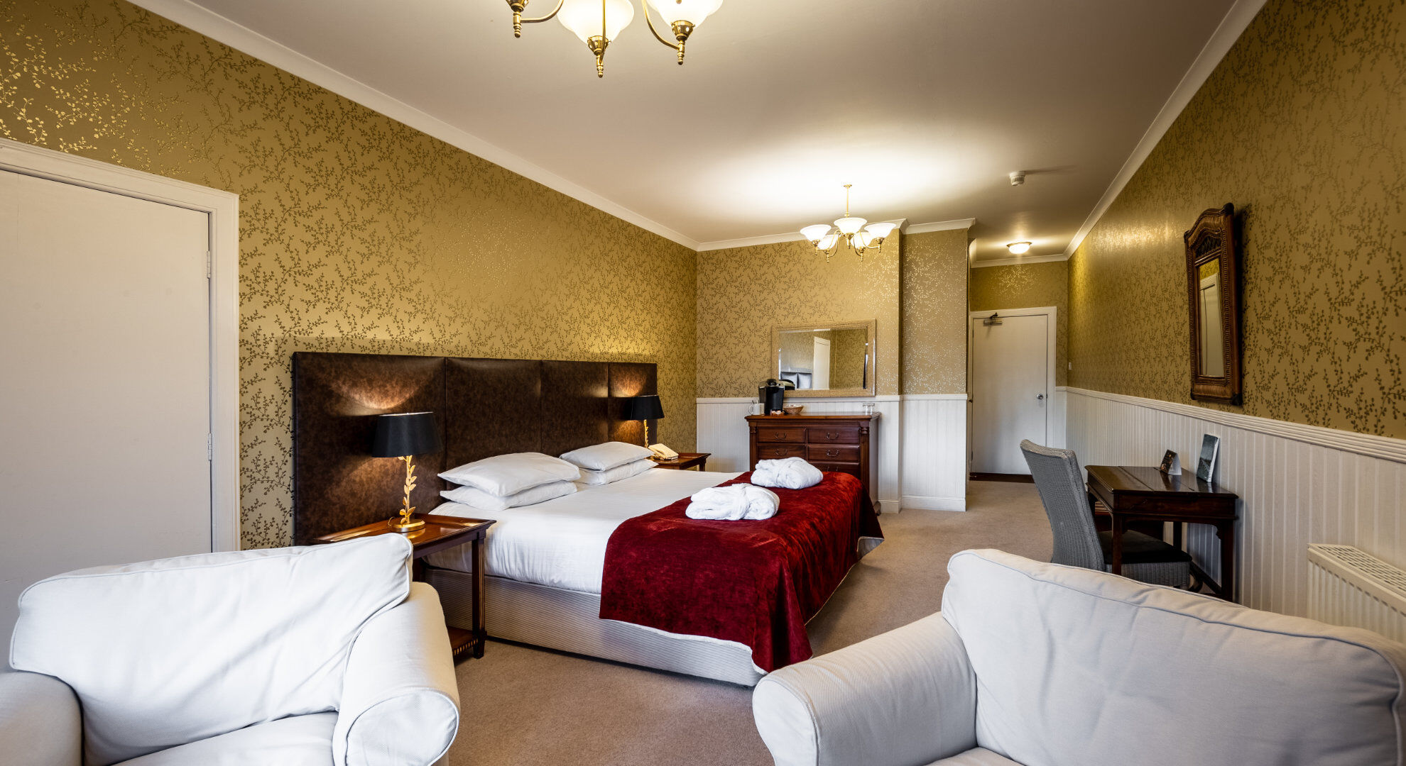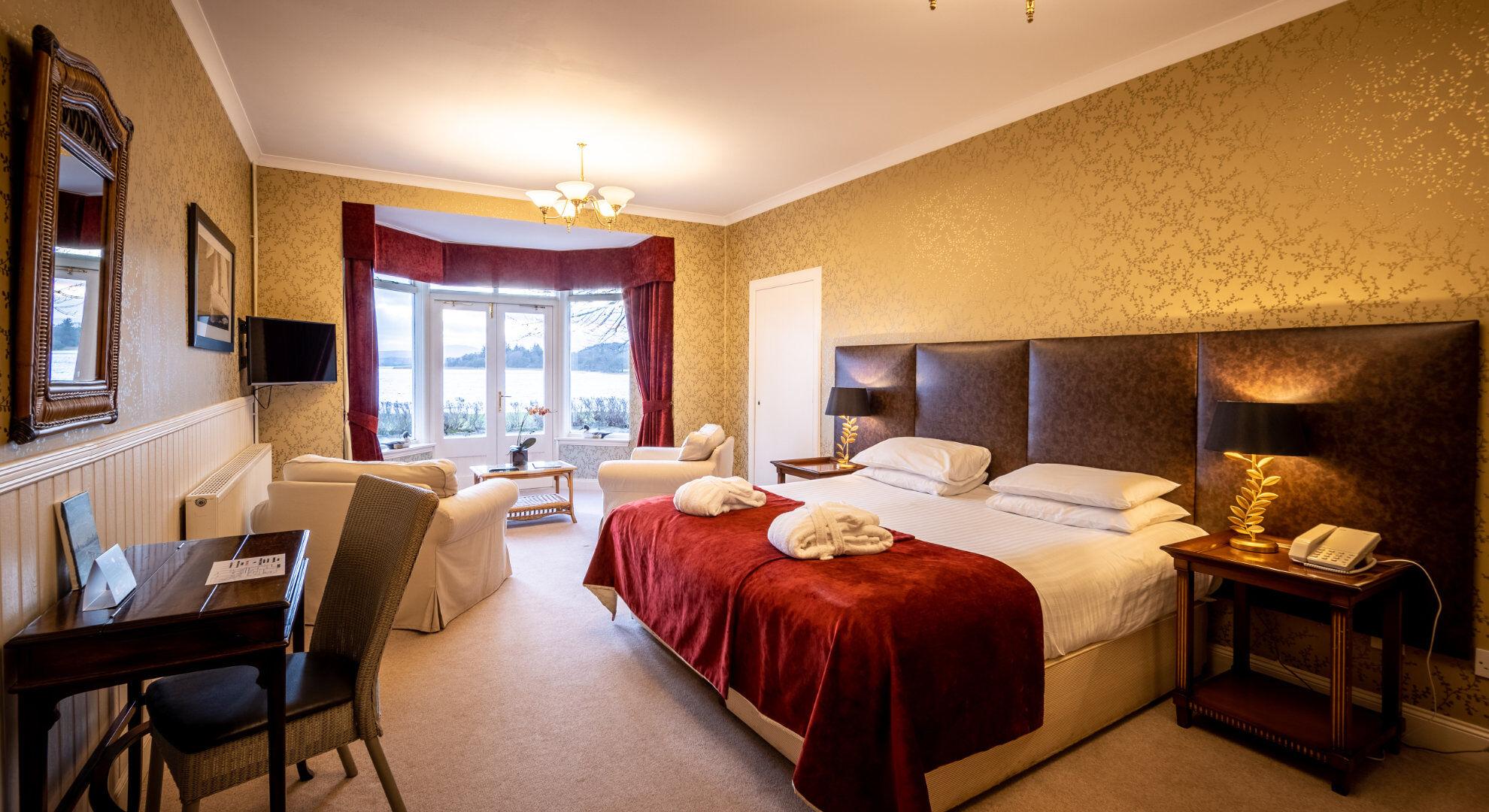 Karma Lake of Menteith Hotel houses a total of eighteen rooms in three different configurations - the Deluxe Room, Superior Room and Heritage Room. The Deluxe Rooms offer large en-suite bathrooms and gorgeous lake views, the Superior Rooms are located on the ground floor rooms feature bay windows offering fabulous unbroken views over the Lake and Heritage Rooms are decadently furnished with moderately-sized en-suite bathrooms.