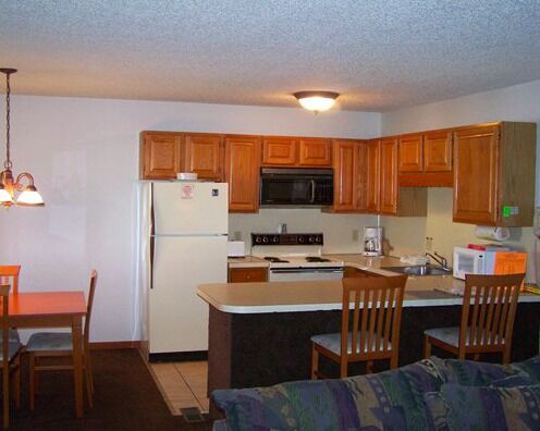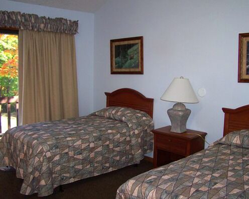 Quail Hollow Village emphasis the concept of luxury amidst the wilderness. These two-bedroom condos are designed to offer plenty of living space with different rooms in which to relax. Bedrooms are roomy with plush beds, and there are fully equipped kitchens for a just-like-home dining experience. Décor is rustic, pleasant and warm, melding perfectly with the alpine setting. Speaking of warm, each condo has a fireplace for atmosphere, and all are nicely carpeted and air conditioned for your additional comfort no matter the season.