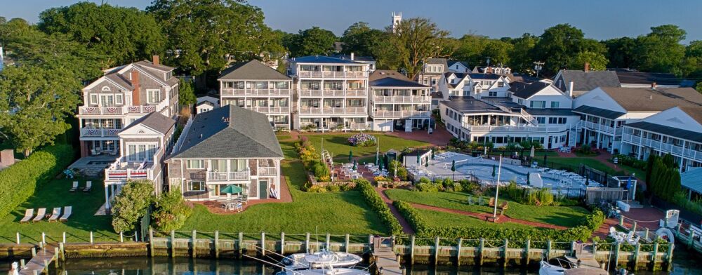 The Harborside Resort Inn is a collection of 19th century whaling captains' homes in Edgartown's historic center on Martha's Vineyard. White painted captains' homes in the Greek Revival style define the town.